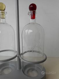 Set composto da due contenitori in vetro con tappo colorato (rosso e giallo), inseriti in un supporto verticale in metallo.