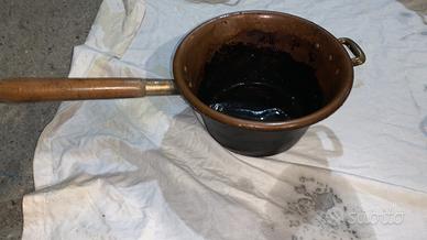 1- Casseruola/tegamino piccolo con manico lungo in legno (e ghiera ottone): diametro ~15-20 cm stimato, interno patina nera intensa da uso su fuoco. Ideale decorativo o per salse (manico legno evita scottature). Valore singolo ~