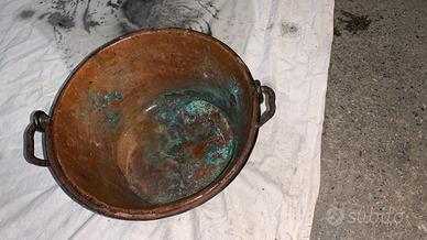 3. Paiolo medio con verdigris verde-turchese interno (intenso ossido naturale, zone blu-verdi belle): diametro ~28-32 cm stimato, manici ferro forgiato. Look “antico autentico” da camino. Valore singolo ~