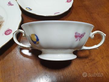 Propongo un set da pasto completo per bambini della prestigiosa manifattura Krautheim & Adelberg, prodotto nell’eccellenza di Selb, in Baviera, (lo storico distretto dove hanno sede le più grandi firme della porcellana mondiale, come Rosenthal). Il servizio risale ai primi anni '70 ed è un raro esempio di conservazione integrale: è rimasto protetto per quasi 56 anni, (la mia età, perché è mio), nel suo imballaggio originale, adagiato sulla paglia protettiva dell'epoca. Non è mai stato usato né lavato, preservando intatte le caratteristiche di fabbrica. Elegante idea regalo. Dettagli e Qualità della Porcellana: • Decori e Colori: Le illustrazioni dei gattini sono straordinarie: i colori sono vividi, saturi e perfettamente definiti, come appena usciti dal forno della manifattura. • Oro Zecchino: Il profilo in oro zecchino sui bordi di ogni pezzo è splendente, specchiato e assolutamente integro. La mancanza di lavaggi ha preservato una brillantezza impossibile da trovare nel vintage usato. • Tazza "Bouillon" a due manici: Un pezzo di rara eleganza pensato per il latte caldo o il brodo. La doppia impugnatura garantisce una presa sicura e bilanciata per le mani dei piccoli. • Piatto Piano e Fondo: Perfetti per le prime pappe o portate principali, con la porcellana bianca e traslucida tipica di K&A. • Portauovo coordinato: Il vero pezzo forte. Quasi sempre smarrito o rotto nelle serie d'epoca, qui è presente e intonso per completare la colazione. Condizioni realmente da "fondo di magazzino". Un set che unisce il fascino del design d'epoca alla qualità insuperabile della manifattura tedesca di Selb. • Ritiro a mano (Preferito): Disponibile a Torre Annunziata (NA), al prezzo di *110,00 €* (prezzo vendita veloce). • In alternativa, spedizione rapida e tracciata a *120,00 €* (spedizione a carico dell'acquirente) *Leggermente trattabile* • Garantisco imballaggio professionale a "doppio guscio". *Disponibile ad inviare altre foto e dettagli.