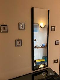 Grazioso set di pensili verniciati in nero per anticamera composto da specchio con cornice e mensola su due piani (piano superiore dotato di specchio). Ottime condizioni. Ideali per qualsiasi locale della casa, specialmente l'ingresso.