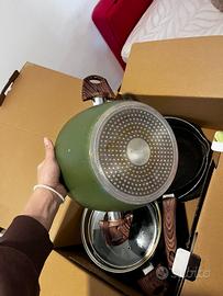 Vendo per passaggio a piano cottura induzione set di pentole e padelle marca Tognana pagato €120 e usato per circa un anno. Normali segni di usura sul fondo come in foto.