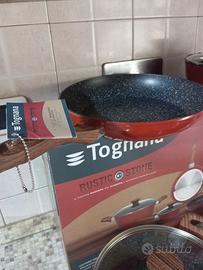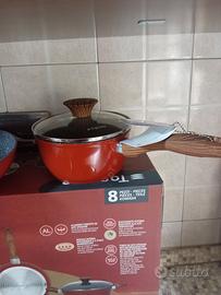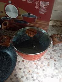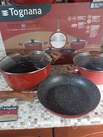set 8 pezzi pentole tognana rustic Stone con manici legno soft touch, alluminio forgiato ad alto spessore, fondo alto spessore per distribuire bene il calore, adatto anche a piani ad induzione composto da: casseruola 2 manici con coperchio cm 24, casseruola 2 manici con coperchio cm 20, casseruola 1 manico cm 16, padella da cm 28 e padella da 24 cm.Coperchi in vetro temperato con sfiato, nuova, odeale anche pee regalo