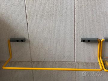 Set per bagno vintage Specchio con due faretti Specchio con mensoline in vetro e porta asciugamani Porta ascougamani Mensola in vetro Gancio Porta rotolo Condizioni ottime Vintage Modernariato Giallo e grigio scuro Anni ‘80