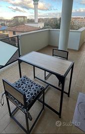 Inoltre aggiungo tavolino per pranzo da esterno con due sedie ( vendo anche i cuscini comprati a parte) tutto da incastro per chiusura in modo da occupare meno spazio. Il tavolo è per due persone comode e una terza persona. Non più di tre.