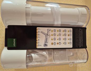 Attrezzo spara biscotti completo, come si vede dalla confezione, di 16 dischi per biscotti e 7 beccucci per decorare torte e altro. Costituito da una plastica di ottima qualità e racchiuso in un comodo contenitore.