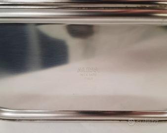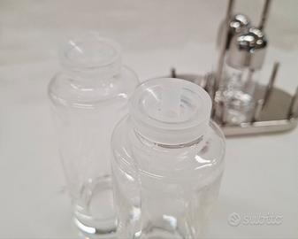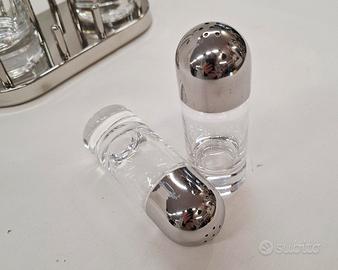 Set da tavola per condimenti Alessi, con dispenser per olio e aceto, sale e pepe e vassoietto in metallo. Venduto come in foto, ottime condizioni.