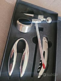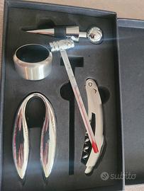 Set per degustazione vini nuovo mai usato composto da tappo in acciaio termometro tagliacorona salvagoccia e cavatappi professionale il tutto in scatola