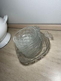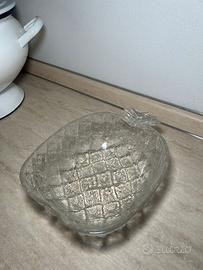 Servizio vintage in vetro a forma di ananas, interno liscio e esterno ruvido in rilievo (proprio come un ananas). Il set è composto da una ciotola grande e sei ciotole piccole, che possono essere impilate per occupare meno spazio. Ideale da portare in tavola per le feste, elegante e delicato, può essere utilizzato per servire frutta, dolci o gelato.