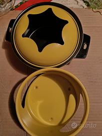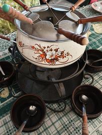 SET pentola e accessori per fonduta 21 pezzi, con supporto base, 6 ciottoline nere con cucchiaini e manico in legno, 6 forchettine con manico in legno e bruciatore, mai usato.