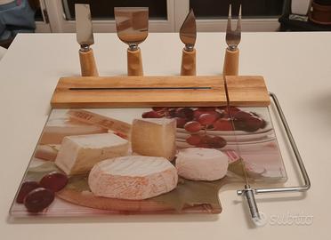 Set per formaggi in vetro, legno e acciaio Easy Life composto da solida base in vetro spesso, supporto in legno magnetico, 4 diversi coltelli per formaggi duri, 1 filo per formaggi molli, pratico ed elegante al tempo stesso, nuovo con scatola.