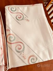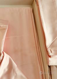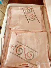 Set per il letto matrimoniale di seta rasata colore rosa , dipinto a mano di alta qualita e raffinatezza, fatto da lenzuolo sotto più lenzuolo per coprire le due federe piu il copre letto sono 5 pezzi