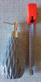 set per lavandino in ceramica composto da portasapone, portaspazzolini e dispenser per sapone liquido. colore grigio brillante. misure 13 cm portasapone, 12 cm portaspazzolini e 12 cm dispenser. prodotti in Cina.