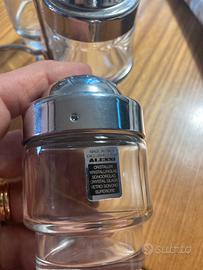 Questo set vintage, prodotto in Italia esclusivamente per Alessi, è un classico servizio per condimenti in cristallo e acciaio inossidabile. L'etichetta visibile nell'immagine conferma che si tratta di vetro sonoro superiore di alta qualità. Caratteristiche principali Composizione: Il set mostrato comprende due contenitori per spezie (sale e pepe) con coperchi forati a cupola e un terzo contenitore aperto, solitamente destinato a stuzzicadenti o senape. Design: Presenta uno stile pulito ed elegante, tipico delle collaborazioni Alessi con designer come Ettore Sottsass, caratterizzato dalla combinazione di cristallo trasparente e finiture in acciaio lucido a specchio.
