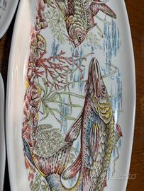Set completo anni 80 per sei persone di piatti rettangolari più un piatto da portata per il pesce, tutto in porcellana pregiata firmata Art Elaboration.