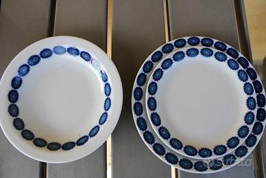 Set di piatti decorati a mano, comprendenti 11 piatti piani, 11 piatti fondi e 11 piattini da dessert. Il set si completa di tre piatti da portata: rotondo, ovale e quadrato.