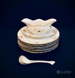 Set di piatti per 6 persone in porcellana Richard Ginori, composto da: 6 piatti lisci grandi Dimensioni: Diametro 25cm // altezza 3cm E la salsiera con cucchiaio Dimensioni: Lunghezza 22cm // altezza 10cm Modello: Vecchia Ginori con decoro floreale bordo oro Condizioni: eccellenti Le foto sono parte integrante della descrizione. #Ginori #Fornasetti #Alessi #Accolay #Seletti #JacquesBlin #Polspotten #Thesocialitefamily_ #Christofle #rogercapron #Zarahome #HMhome #jacquespouchain #robertpicault #bitossi #Memphis #Cloutier #Sottsass #lalique #moretti #vitra #daum #gioponti #starck #Trudon #Vallauris #vintage #brocante #retro #vintage #deco #decoration #ideedeco #ideecadeau #artsdelatable #antique #ancien #patine x #patina #shabbychic #wabisabi #japandi #scandinavianstyle #hygge #interior #interiordesign #interiordecoration #interieur #decorationinterieur #polspotten #hay #collection #porcelaine #limoges #faience #verre #murano #design #midcenturymodern #antiquemarket #fleamarket #artdeco #artnouveau #modernisme #brutalisme #décoindustrielle #annees50 #annees60 #annees70 #50s #60s #70s #faitmain #ceramics #studioceramics #studiopottery #pottery #terracotta #terrecuite #marbre #onyx #travertin #Zara #meissen #meissenporcelain #zsolnay #zsolnaypecs #herend #herendporcelain #richardginori #royalalbert #villeroyboch #botanica #royalcopenhagen #royalcopenhagencollection #rosenthal #porzellan #porzellangeschirr #porzellanteller #candela #candelaprofumata #yankeecandle #floradanica #royalcopenhagencollection #royalcopenhagenchristmas #royalcopenhagenfigur #statuine #statuinedacollezione #denmark