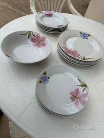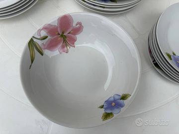 Vendo set di piatti con insalatiera. Il set include: 6 piatti lisci grandi 6 piatti lisci piccoli 5 piatti fondi 1 insalatiera Uno dei piatti fondi presenta una piccola usura, ma tutto normale dato che sono in ceramica. Il set non è mai stato utilizzato ed è sempre rimasto dentro uno scatolone. Data la fragilità preferisco non spedire per non rischiare di romperli. Per ulteriori informazioni o foto non esitate a contattarmi.