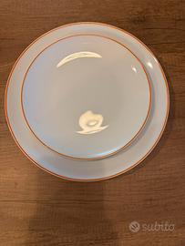 Un piatto fondo ed un piatto piano bianco con bordo arancione.