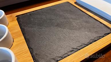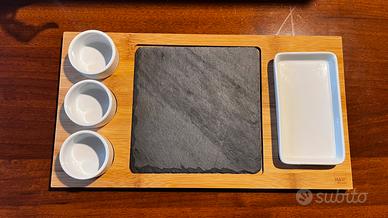 Set ardesia, bomboo e porcellana per sushi e altro. Marca H&H. Set composto da 3 ciotole, 1 vassoio medio e un piatto in ardesia. Mai usato.