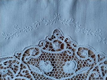 Lenzuolo sopra: inserti in pizzo dal disegno floreale ricamato a mano, con festoni e cordoncino