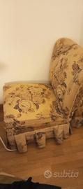 due poltroncine da camera più panchetto, tessuto a tema floreale anni 50 tonalità marrone/verde giallognolo su fondo beige