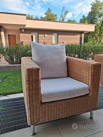 Set due Poltrone in legno rattan con tavolino abbinato. Poltrona 81x78x68h con cuscini sfoderabili. Tavolino 60x60x64h con ripiano in vetro.