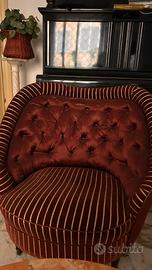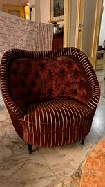 Le poltrone conservano la tappezzeria originale d’epoca; come visibile in fotografia, il tessuto presenta segni di usura e si consiglia il rifacimento del rivestimento. Su richiesta possiamo fornire un preventivo per la nuova tappezzeria: collaboriamo con tappezzieri artigiani di grande esperienza, specializzati in lavorazioni tradizionali.