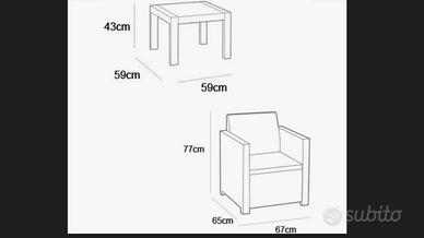 Vendo set 2 poltrone e tavolino da esterno con due cuscini il tutto ancora nello scatolone originale e sigillato. Mai usato. Modello Atlanta Balcony set di Allibert. Nelle foto trovate anche le misure.