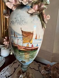 Brocche in porcellana Capodimonte antiche decorazioni floreali ben conservate (uno brocca ha il becco incollato) e scatola ovale con decorazioni floreal. Vendo anche separatamente
