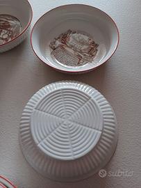 Colore bianco con profilo aragosta. Misure (parte alta): zuppiera diametro 25,5 cm – fondine diametro 18,5 cm.