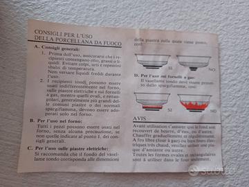 Servizio in porcellana adatto alla cottura dei cibi direttamente su fuoco/piastra elettrica o in forno, composto da zuppiera + 6 fondine con all’interno stampe con ricette di cucina.