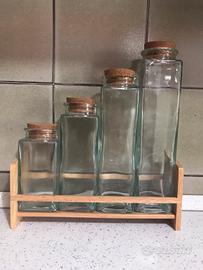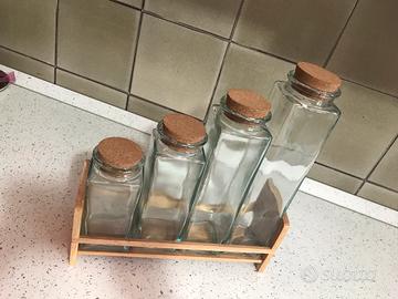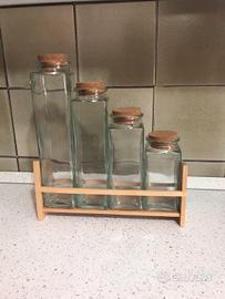 Vendo bellissimo ed elegante NUOVO CON SCATOLA, della linea " FRUTTI DELLA NATURA " set di 4 barattoli quadrati in vetro con tappi in sughero e con base in legno naturale, ideale anche X un regalo.