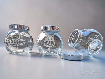 Set di 3 porta spezie in vetro con incisione laser.