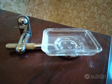 Set portaoggetti vintage da bagno composto da: portasciugamani, portasapone, portarotolo in acciaio cromato e vetro.