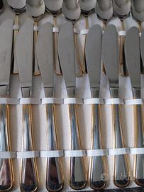 set posate Salvinelli, per 12 persone in totale 125 pezzi, in acciaio inox con bordi in oro zecchino 24 carati, regalo di nozze mai usato (anni '80)