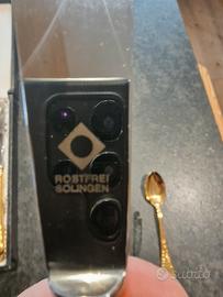 Set posate vintage Rostfrei Solingen placate oro 18/8 23 carati. Le posate non sono mai state usate, con scatola originale un po' rovinata