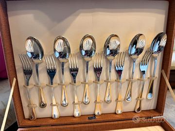 Set completo di posate d’epoca (anno 1969), composto da cucchiaio, forchetta e coltello per 6 persone. Realizzate in acciaio inox 18/10 e laminate in oro zecchino. Elegante servizio vintage, ideale per collezionisti o per una tavola raffinata.