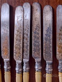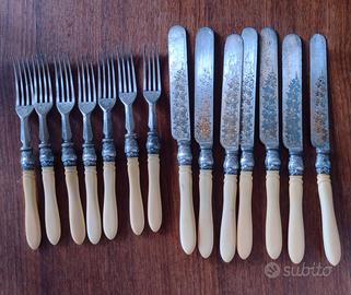 Set di quattordici posate da dolce (sette forchette, sette coltelli) con manico in bachelite? da riargentare. Lunghezza coltello cm 22, forchetta cm 18. La galvanizzazione costa dai 7 ai 10 euro a posata circa.