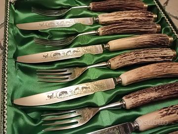 Stupendo set nuovo, interamente realizzato a mano, con manici in vero corno di cervo e incisioni raffiguranti selvaggina.