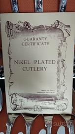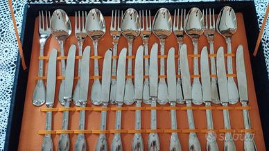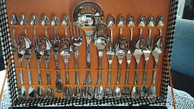 Set di posate in acciaio placcato in nickel da 51 pezzi: 12 forchette, 12 cucchiai, 12 coltelli, 12 cucchiaini, 1 forchetta e 1 cucchiaio per verdura, 1 mestolo per brodo. Con scatola originale in perfette condizioni
