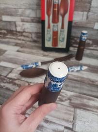 Set posate da portata con sale e pepe HOSTESS SERVER SET. Posate e boccette in legno con inserti in porcellana decorato a mano.