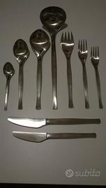 12 cucchiai tavola, 12 forchette tavola, 12 coltelli tavola, 12 forchette frutta, 12 coltelli frutta, 12 cucchiaini tè, 3 utensili da portata.