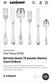 Posate 24 × Forchette da tavola 12 × Cucchiai da tavola 12 × Coltelli da tavola (punta arrotondata) 12 × Forchette da frutta 12 × Coltelli da frutta 12 × Cucchiaini da tè 12 × Cucchiaini moka 12 × Forchette da pesce 12 × Coltelli da pesce 12 × Coltelli da arrosto / carne Altri articoli 23 × Panni in velluto
