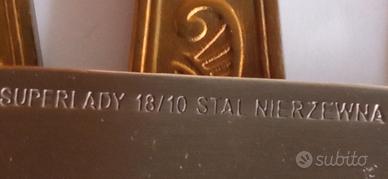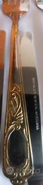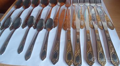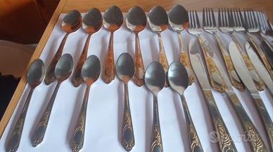 Vendo set posate vintage in acciaio inossidabile con dettagli dorati sui manici,6 cucchiai,6 forchette,6 coltelli,6 cucchiaini.Euro 10