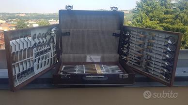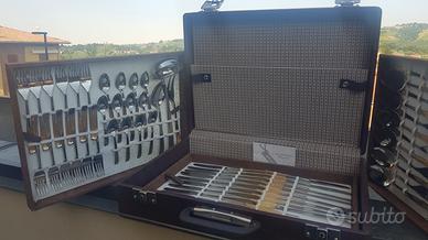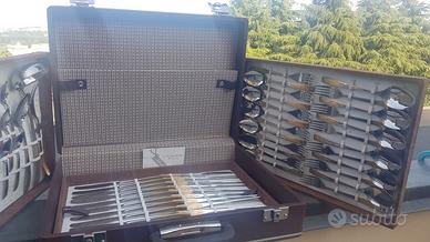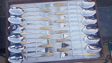 vendo set di posate 24 pezzi in valigetta molto belli mai usati risalenti al 1984 ditta Corvida Italia Inoxpran assolutamente tutte utilizzabili coltelli seghettato (che tagliano per intenderci). In acciaio 18/10 e con decorazione bagnata in oro zecchino con garanzia dell'azienda