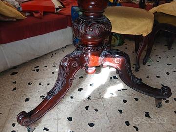 Tavolo Centrale: In pregiato mogano con piano tondo decorato da una fitta baccellatura intagliata a mano. Basamento centrale a "piovra" riccamente lavorato, dotato delle sue 3 rotelle.