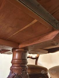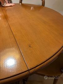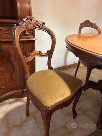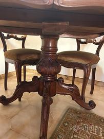 Vendo set da pranzo PERFETTO antico composto da un tavolo rotondo e sedie, in stile Luigi Filippo, riconoscibile dagli intagli decorativi sul legno di noce. Tavolo: Realizzato in legno massello, solitamente rotondo con un basamento centrale lavorato, allungabile. Sedie: Caratterizzate da uno schienale spesso definito "a mongolfiera" con intagli decorativi e sedute imbottite. Misure: tavolo chiuso 115x115 tavolo aperto 160x115 Ritiro a Carovigno. prezzo trattabile