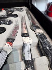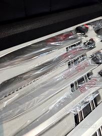 Set Professionale da Chef BergHOFF – 16 Pezzi con Valigetta 🔪 Vendo esclusivo set di coltelli professionali BergHOFF, marchio leader negli accessori da cucina. Il set originale è completo di 16 pezzi di alta qualità, progettati per ogni tipo di taglio e preparazione, il tutto racchiuso in una pratica ed elegante valigetta diplomatica nera con chiusura di sicurezza a combinazione. Purtroppo mancano alcuni modelli di coltello non presenti. Si vende tutto quanto si vede in foto. Punti di Forza: * Materiale: Realizzati in acciaio inossidabile al cromo (Chromstahl X20CR13), temperato e affilato a mano per una precisione di taglio superiore. * Condizioni: MAI USATO. Molti pezzi sono ancora sigillati nella plastica originale. * Versatilità: Include coltelli da chef, da pane, da prosciutto, mannaia, forbici universali, forbici per pollame. * Valore aggiunto: Inclusa la barra magnetica (da 33 cm) per esporre i coltelli sulla parete della cucina. * Valigetta rigida professionale per il trasporto in sicurezza. Vendo zona Aranova su Aurelia RM