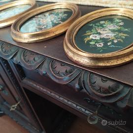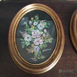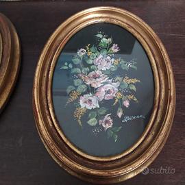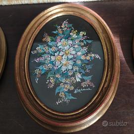 Tre quadretti con fiori dipinti. Cornice vintage ovale dorata e vetro. Misura 15,5×20